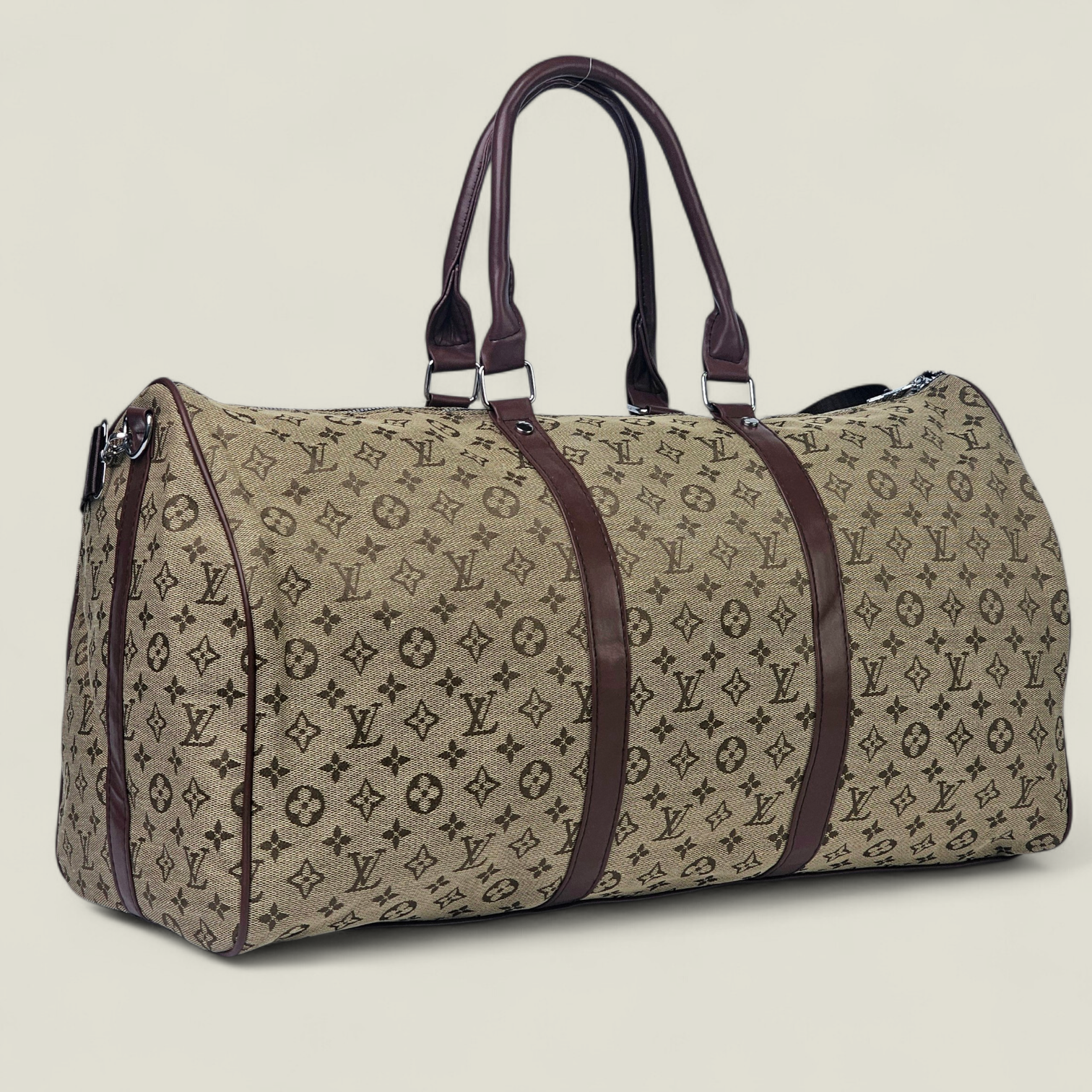 Sac à Roulettes Beige: A stylish travel companion constructed with reinforced beige-toned canvas enriched with signature monogram patterns. The adjustable strap, sturdy zipper, and dark interior lining ensure practicality and sophistication. The polished metallic zipper accents complete its refined look.