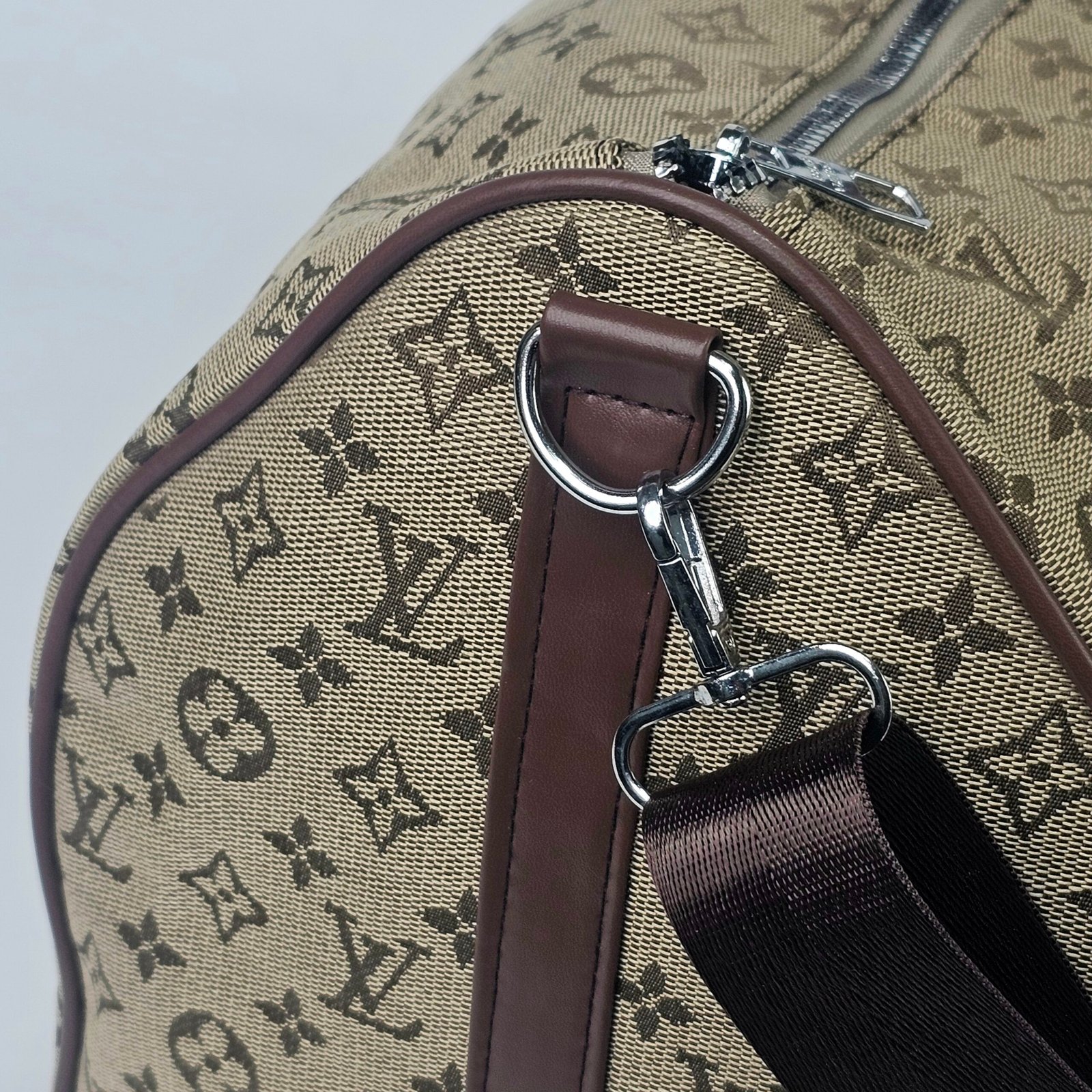 حقيبة بيج بعجلات: رفيقة سفر أنيقة مصنوعة من قماش متين بلون بيج مزين بنقوش المونوغرام المميزة. يضمن الحزام القابل للتعديل والسحاب المتين والبطانة الداخلية الداكنة العملية والرقي. وتُضفي لمسات السحاب المعدني المصقول لمسة نهائية راقية.