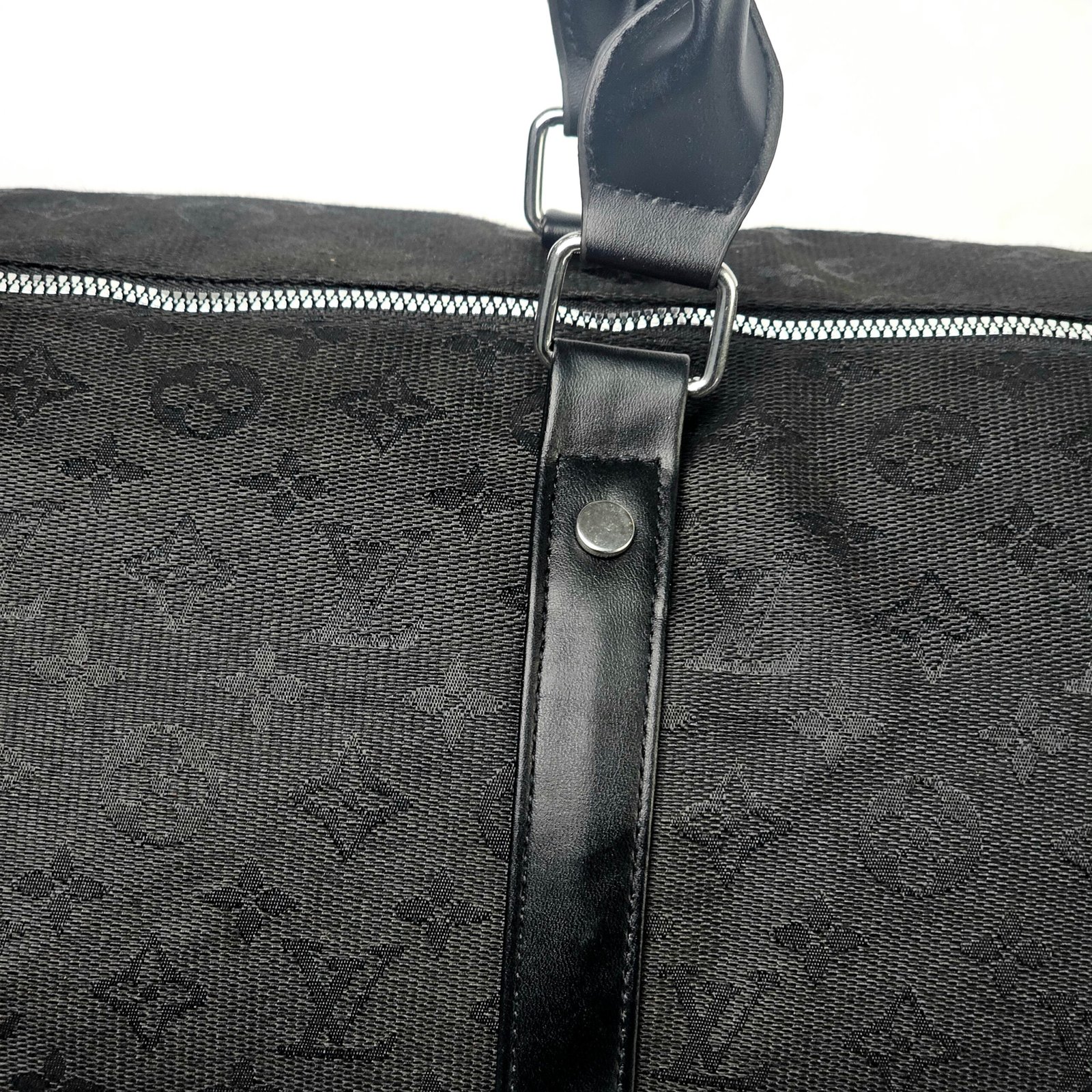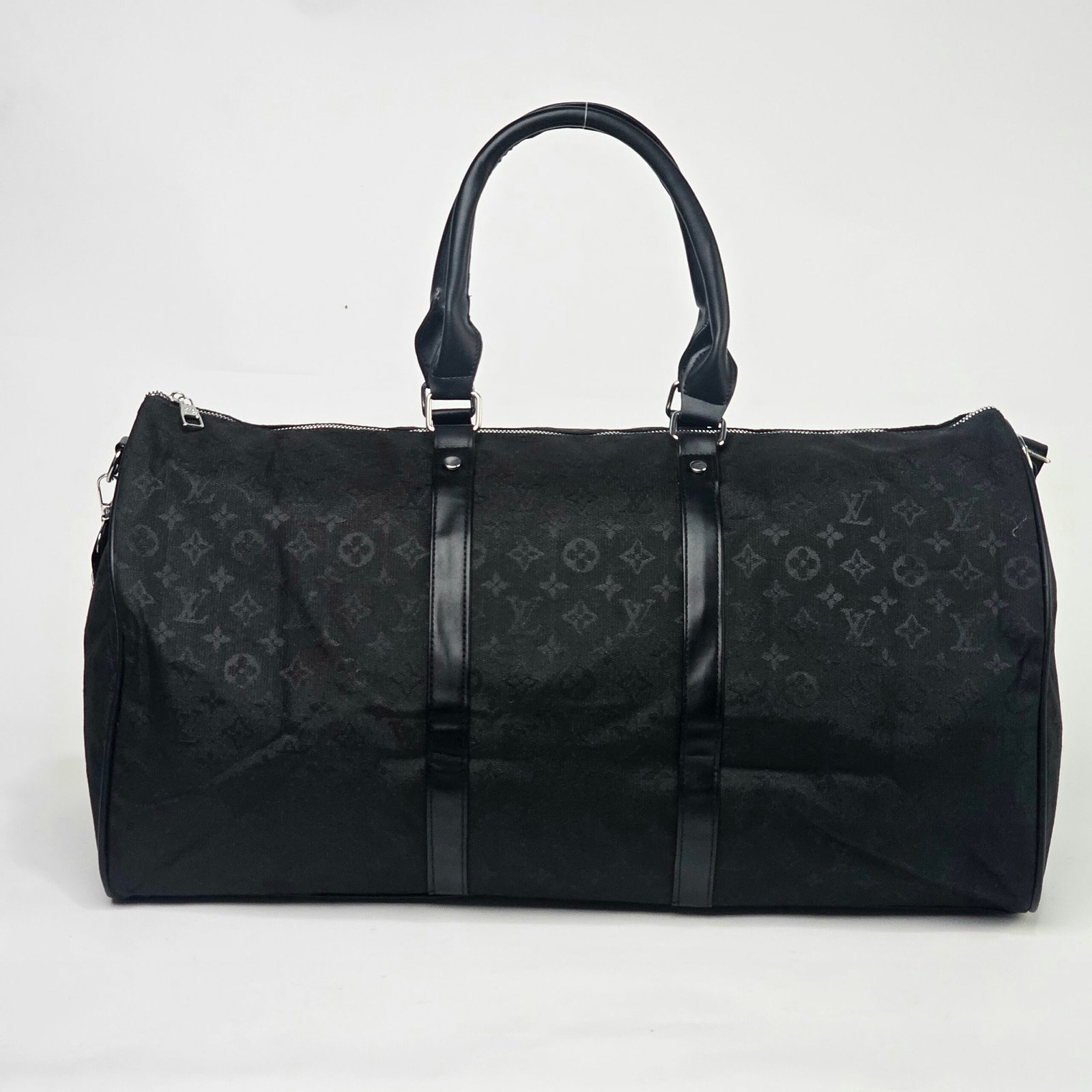 حقيبة سوداء وبيضاء بعجلات: تحفة فنية أحادية اللون تجمع بين التصميم العصري وفخامة لويس فويتون المعهودة. مصنوعة من قماش متين عالي الجودة بنقوش المونوغرام باللونين الأسود والأبيض، تتميز الحقيبة بحزام قابل للتعديل وسحابات معدنية فاخرة وبطانة داخلية داكنة مصممة بدقة متناهية، ما يمنحها أناقة عملية.