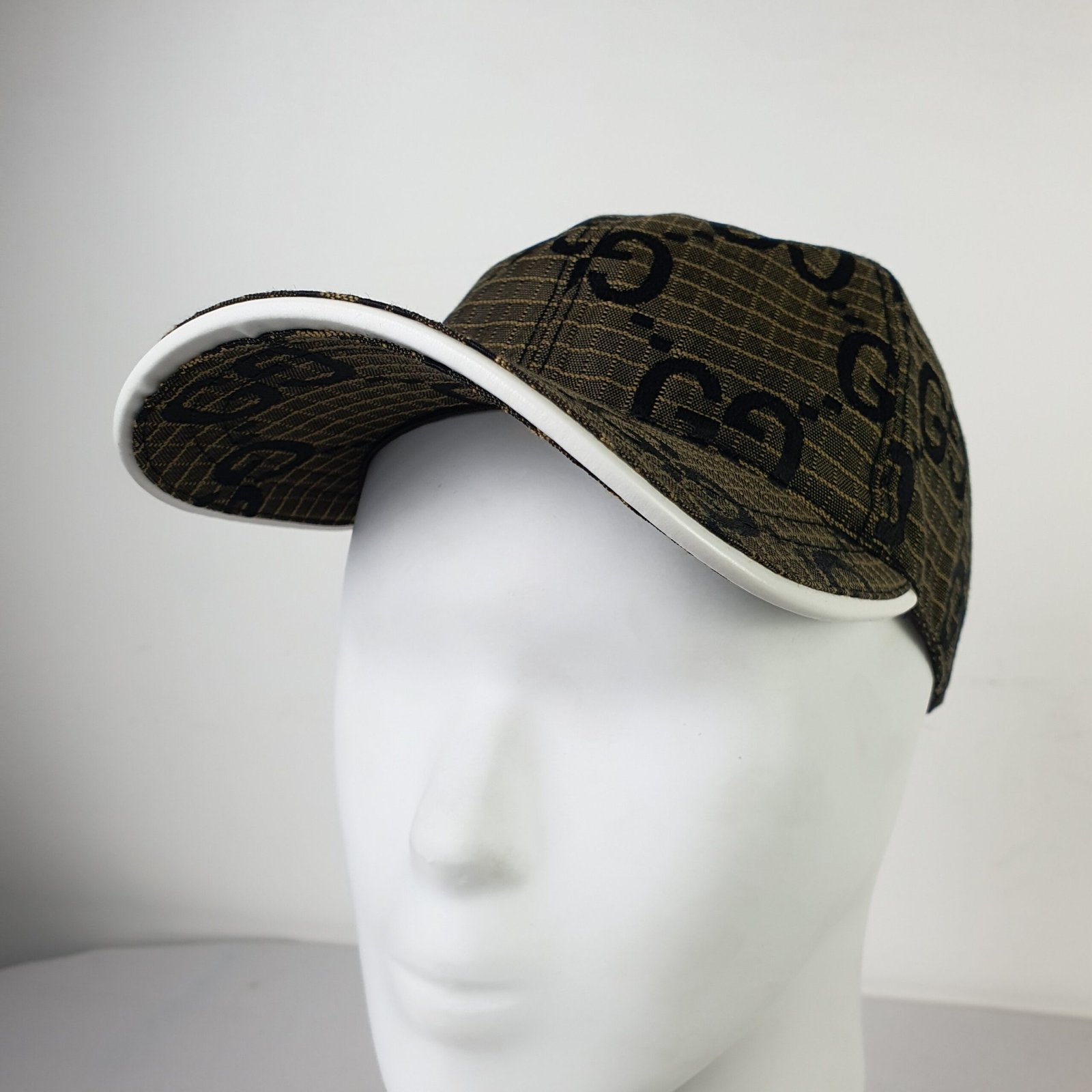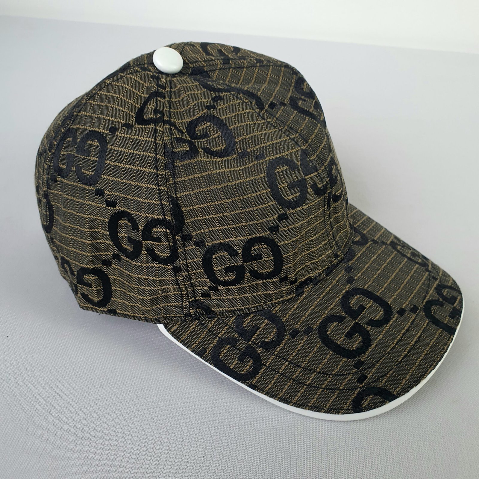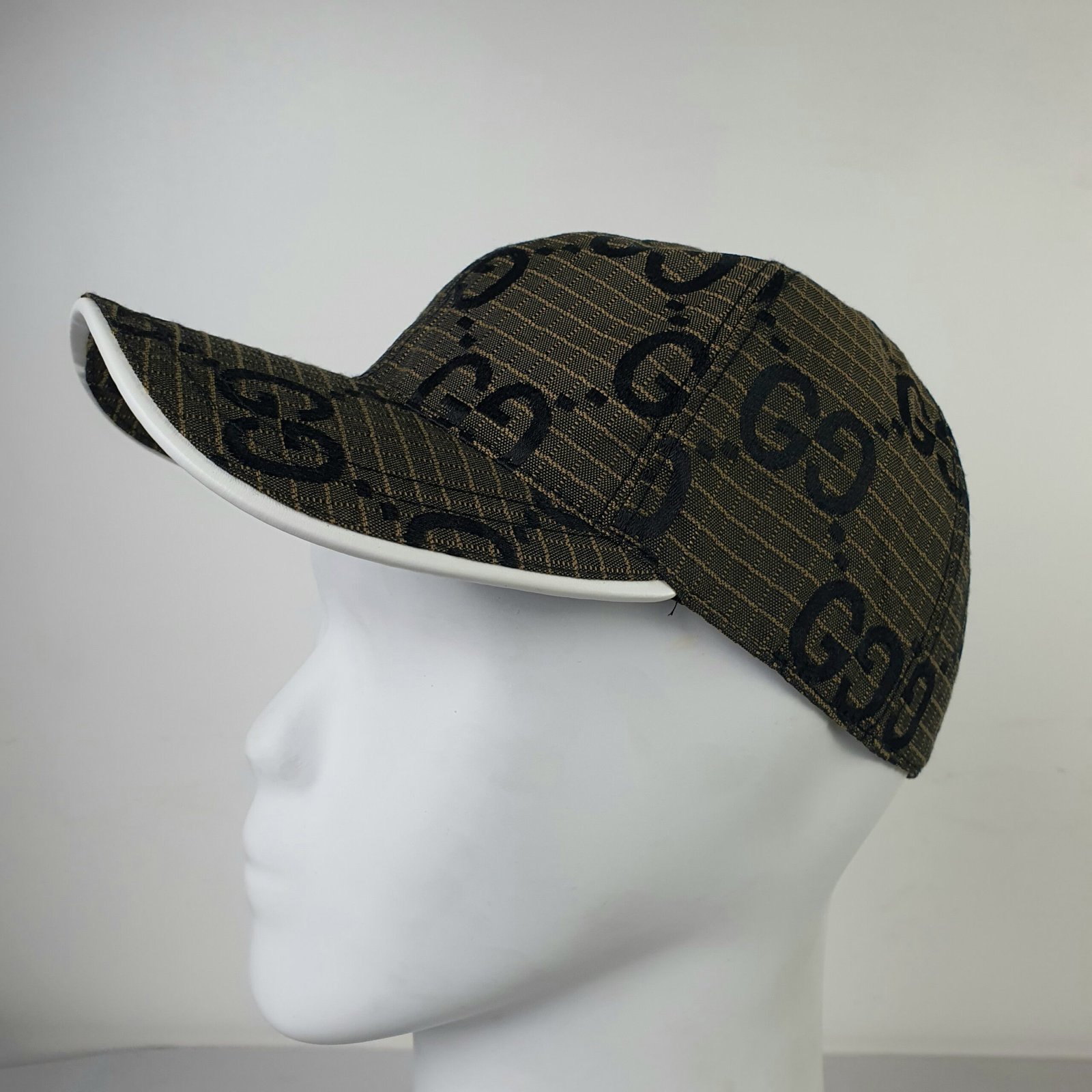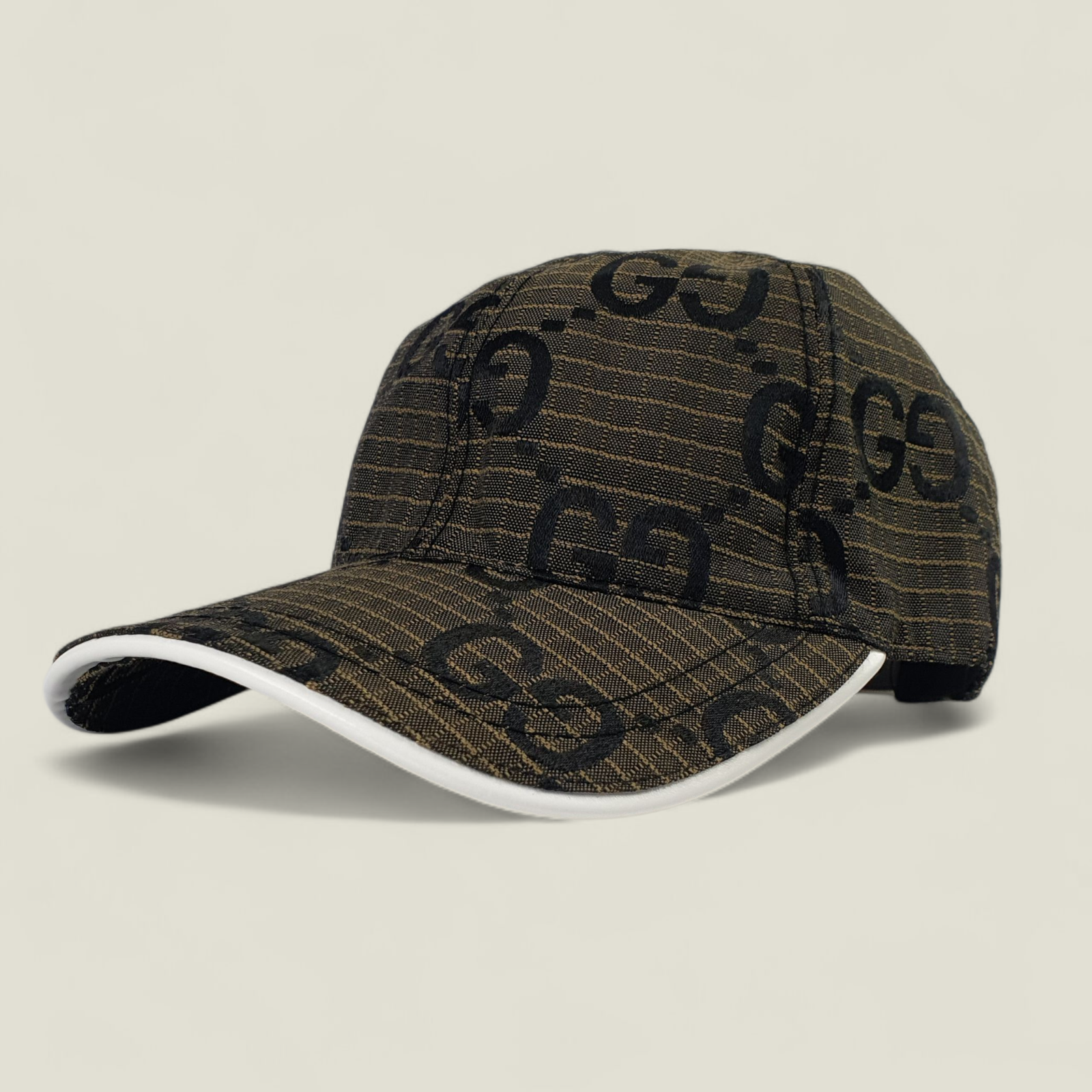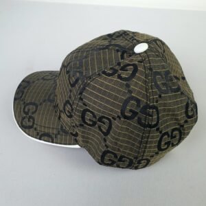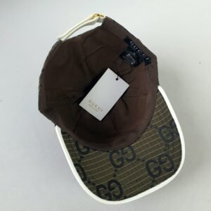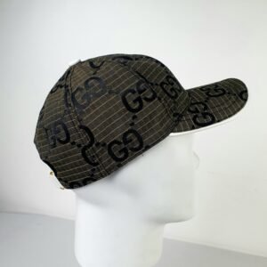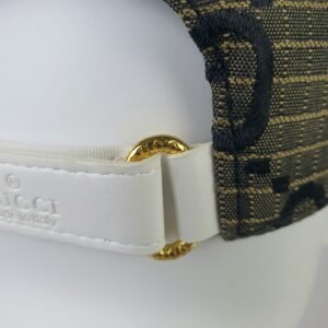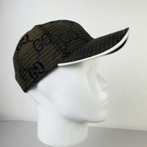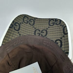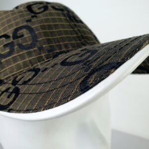 Crafted from premium brown mesh, the GUCCI cap showcases the brand’s iconic GG logo in striking black print. This bold design statement highlights the brand’s identity while adding an unmistakable touch of class to any outfit. The white visor introduces a contemporary contrast to the classic structure, ensuring a unique aesthetic appeal that complements diverse styles.