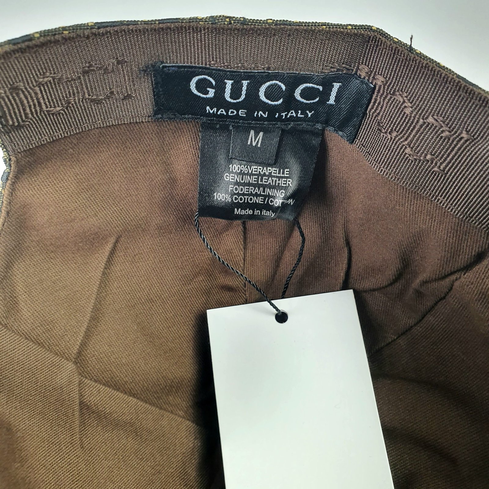 The interior of this premium cap is thoughtfully lined with high-quality cotton for optimal comfort. As a testament to exceptional craftsmanship, it features genuine leather accents (100% authentic leather), making it both comfortable and durable. Whether worn casually or as a statement accessory, the GUCCI cap provides a luxurious feel that enhances its practicality and longevity.