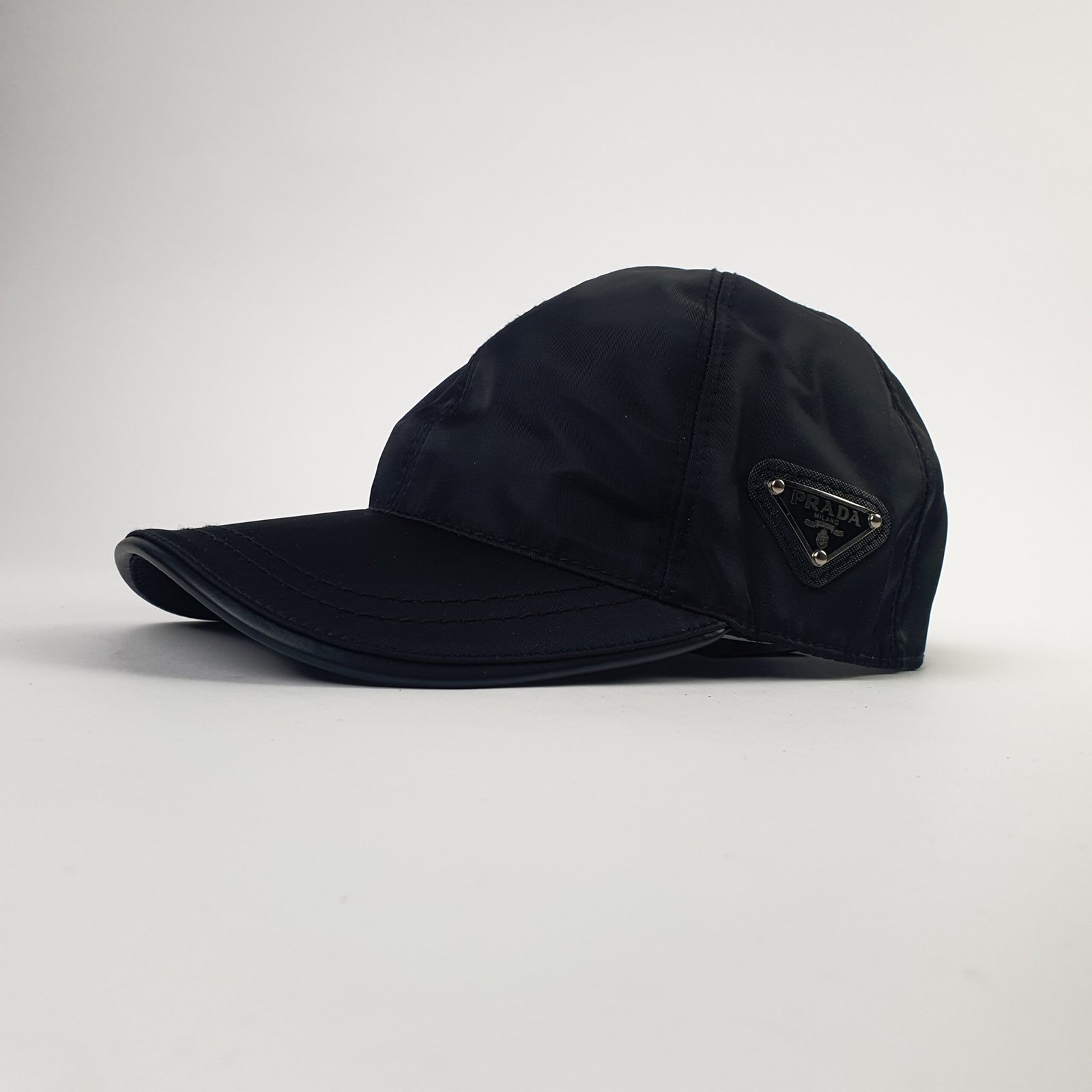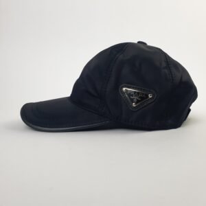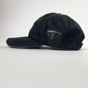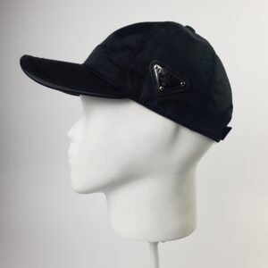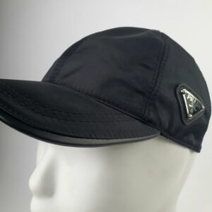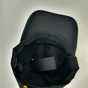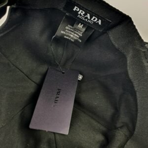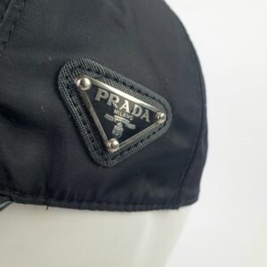 Les coutures soignées du chapeau témoignent du savoir-faire inégalé de la célèbre maison italienne. La plaque métallique à trois faces, ornée du logo Prada et fixée par quatre petits rivets précis, est un détail emblématique qui ajoute une touche de luxe. Les inscriptions « PRADA » et « Milano » reflètent l’héritage de cette marque reconnue mondialement dans le domaine de la haute couture.