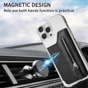 Ce porte-cartes et monnaie est équipé d’un système magnétique avancé qui assure une fixation sécurisée. Que ce soit sur votre téléphone, ou dans votre voiture comme support pratique, le système magnétique garantit une stabilité optimale. Cela rend ce produit polyvalent et idéal pour les déplacements en voiture ou pour les moments où vous utilisez votre téléphone comme GPS. En un clin d’œil, vous avez accès à vos cartes ou pouvez ajuster la position de votre téléphone.