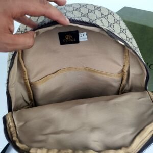 تتميز الحقيبة بأجزاء معدنية فضية اللون، مزينة بنقش “غوتشي صنع في إيطاليا”. الجيب الأمامي مزين بفخر بشعار غوتشي المزدوج المتشابك، مما يضفي عليها لمسة من الرقي. في الداخل، ستجد حجرة رئيسية واسعة مبطنة بقماش بيج/بني فاتح. يُضفي ملصق جلدي أسود منقوش عليه شعار غوتشي الذهبي وعبارة “صنع في إيطاليا” بصمةً على أصالتها، ويعززها بطاقة مرقمة ظاهرة في الداخل.