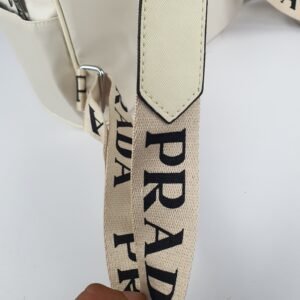 تُضفي هذه الحقيبة لمسة عصرية على لونها الأبيض العاجي الأنيق. أحزمة الحقيبة الفريدة، المصنوعة من قماش بيج متين ومنقوش عليها اسم العلامة التجارية “برادا”، تُضفي عليها لمسة جريئة تُميزها عن الإصدارات الكلاسيكية. مساحتها الداخلية الرحبة، المبطنة بجاكار أسود والمزينة بشعار برادا، تحمي مقتنياتكِ وتُضفي عليها لمسة من الفخامة. جيب أمامي كبير بسحاب، وجيبان جانبيان مفتوحان، وسحابات معدنية محفور عليها اسم “برادا” تجعل هذه الحقيبة عملية وأنيقة للغاية.